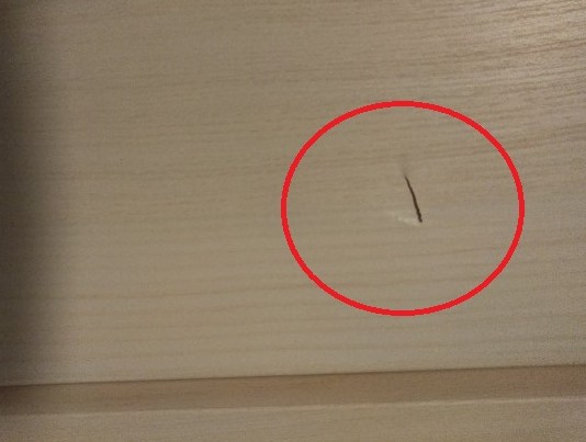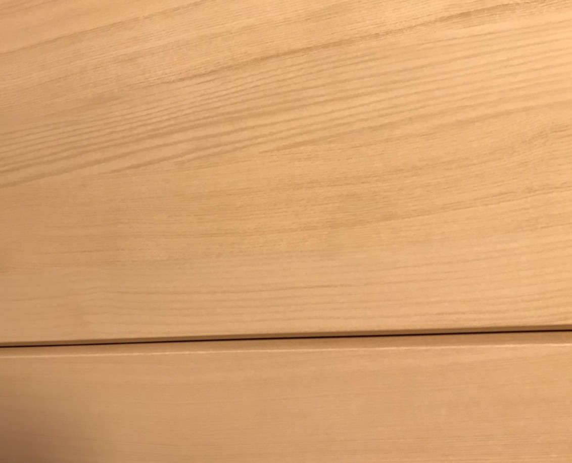 収納の上部シート化粧材の板のど真ん中に大き目な凹みがあり、じっくりと時間をかけて、目立たない仕上がりにしました。