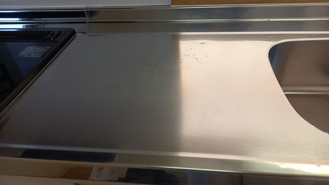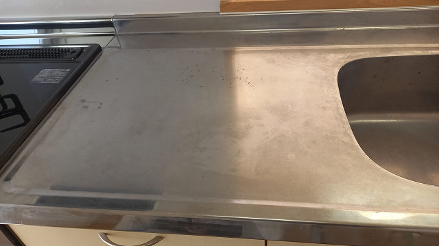 中古物件キッチンのステンレス製ワークトップが生活キズでだいぶくすんでおり、特殊研磨作業で綺麗な光沢に戻したい。